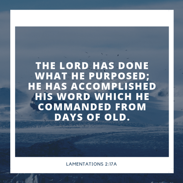 Today’s read took us to the first two chapters of Lamentations. This poem is attributed to Jeremiah, although no author is referenced. The first chapter describes Jerusalem’s misery, but the second chapter is what struck me the most today, as it leaves no doubt the source of that misery. Whenever we read the Bible, our first question should be, “What does this teach me about God?” First and foremost, the Bible is God’s revelation of Himself, and the picture we have in Lamentations 2 is not one we like to consider.Jeremiah describes what God has done to His beloved city and chosen people because of their sin. He has “covered them with a cloud of His anger,” burned like a “flaming fire that consumes everything around it,” and “poured out His wrath like fire.” He has destroyed, laid waste, rejected, abandoned, determined to tear down, cut off, withdrawn, and slain. These are not descriptive terms we like to attribute to the God who loves us so much He would send His own Son to sacrifice His life for us. It’s difficult to reconcile the anger of God against sin with His love for us, but isn’t that what the cross does? God’s wrath poured out against sin…only not on the one who sinned, but on the perfect, holy substitute?