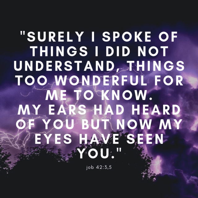 “I know that you can do all things; no purpose of Yours can be thwarted. … Surely I spoke of things I did not understand, things too wonderful for me to know. … My ears had heard of you but now my eyes have seen you.” (see 42:1-6) Job’s attitude that he deserved to know the WHY dissolved in humility; in light of WHO God is, the WHY didn’t matter. Held up to the power and authority and creativity and mastery and glory of God, a small window of suffering was insignificant. God had wisdom that he could not even fathom. God’s purposes and ideas were so far beyond his thinking. God had pulled back the curtain of human understanding and given him a glimpse of Himself. All Job could do was fall on his knees and repent.
