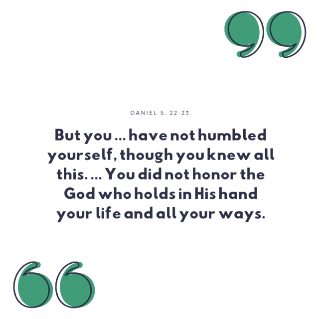 Why did God take the kingdom from Belshazzar? What was his downfall? As Daniel interprets the message, he reminds the king of what happened to Nebuchadnezzar. “When his heart became arrogant and hardened with pride, he was deposed from his royal throne and stripped of his glory. … You, Belshazzar, his son [descendant], have not humbled yourself, THOUGH YOU KNEW ALL THIS. … You did not honor the God who holds in His hand your life and all your ways.”