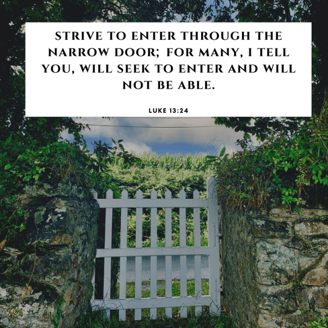 Today’s read came from Luke 13-18 in which Jesus tells several parables. Jesus tells us there are two types of people: those who will enter the kingdom of heaven, and those who will not. He reminds us that there will come a time when the door to the kingdom will be closed and warns us that the way into the kingdom is narrow. And, sadly, that the number of people who will enter heaven is far fewer than those who will be refused entry because they did not believe.