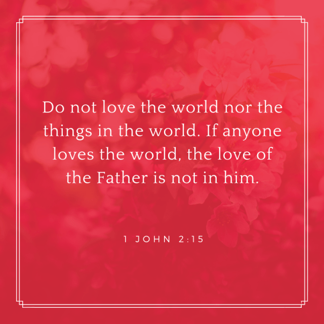We are commanded not to love the world (2:15) but are to do the will of God (2:17) because the world is passing away, but we will live forever. We live for eternity, not for this present world. We invest our time, energy, money, and talents for God’s kingdom, not the kingdom of this world, which belongs to our enemy (5:19). If the opposite of loving the world is doing God’s will, then to love the world is to focus on self (lust of the flesh, lust of the eyes, boastful pride of life), i.e., spend my time, energy, money and talents for the things I want, need, or feel that I deserve, as one comment said. Another friend alluded to this when she spoke of a daily inventory of our actions and motivations. What do we spend our time on? What do we think about the most? Where does our money go? At the end of the day, have we advanced “our” kingdom, or God’s?