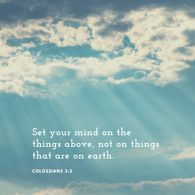 This tells me that we are not just to think about heaven (and all that happens there, and all it represents) occasionally, as in “we’ll get there someday, but right now I’m concerned about what’s happening here.” Instead, we are let “the things above” be the driving force and motivation of all that we think and do. It should be our constant mental companion, influencing our decisions, our mood, our attitude, and undergird every goal or purpose we set out to accomplish.