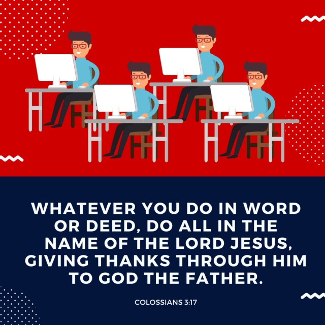 Colossians 3:17,23-24 – Whatever you do in word or deed, do all in the name of the Lord Jesus, giving thanks through Him to God the Father. … Whatever you do, do your work heartily, as for the Lord rather than men, knowing that from the Lord you will receive the reward of the inheritance. It is the Lord Christ whom you serve.