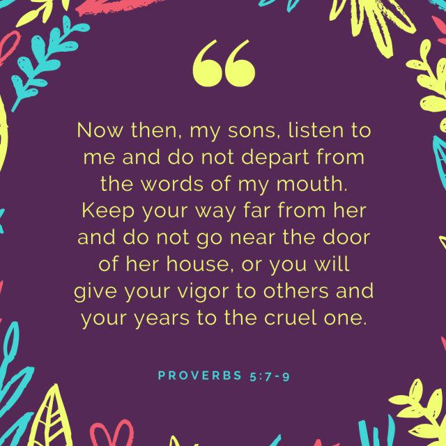 Now then, my sons, listen to me and do not depart from the words of my mouth. Keep your way far from her and do not go near the door of her house, or you will give your vigor to others and your years to the cruel one.