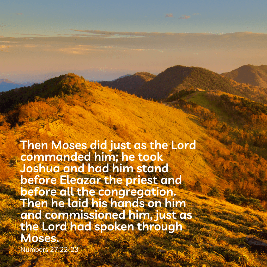 In Numbers 27, Moses is preparing for his pending death. God tells him that Joshua’s day has finally come. No longer to be “second in command” or the man who stands in the shadow of others, Joshua is commissioned as the new leader of this vast people and charged with the incredible responsibility of taking possession of their new home. They will fight battles against enemies, but he will also have to settle conflicts between his people. It was a huge responsibility.