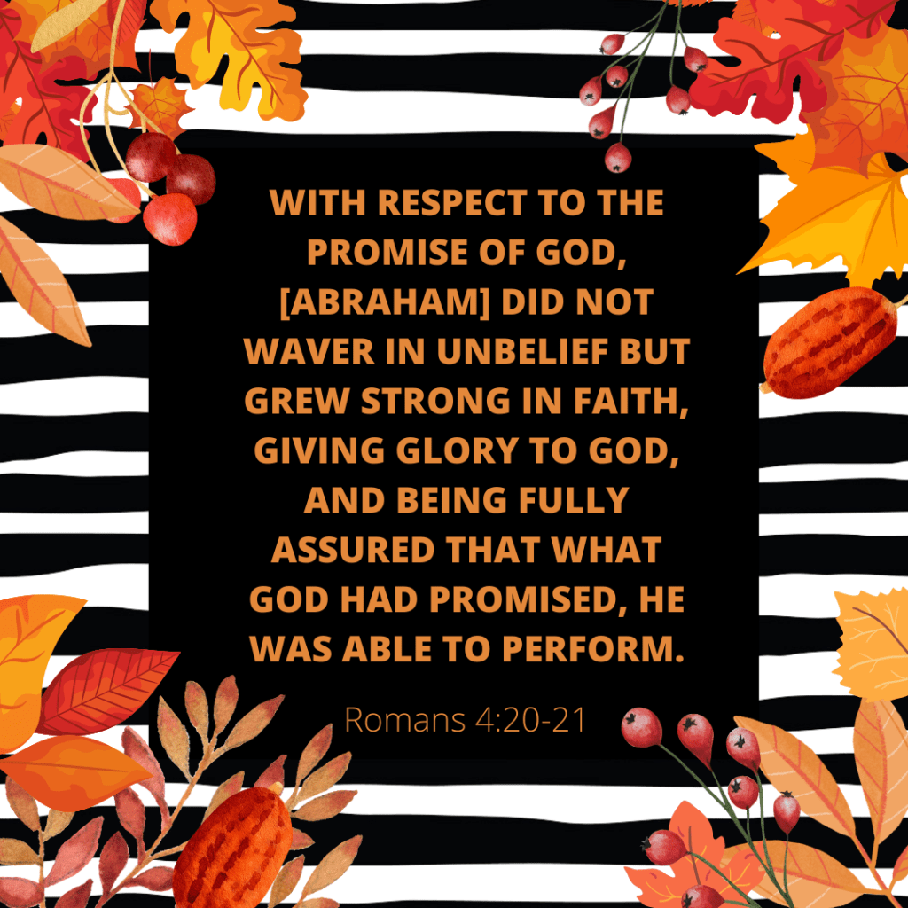 In hope against hope he [Abraham] believed, so that he might become a father of many nations according to that which had been spoken, “So shall your descendants be.” Without becoming weak in faith he contemplated his own body, now as good as dead since he was about a hundred years old, and the deadness of Sarah’s womb; yet, with respect to the promise of God, he did not waver in unbelief but grew strong in faith, giving glory to God, and being fully assured that what God had promised, He was able to perform.