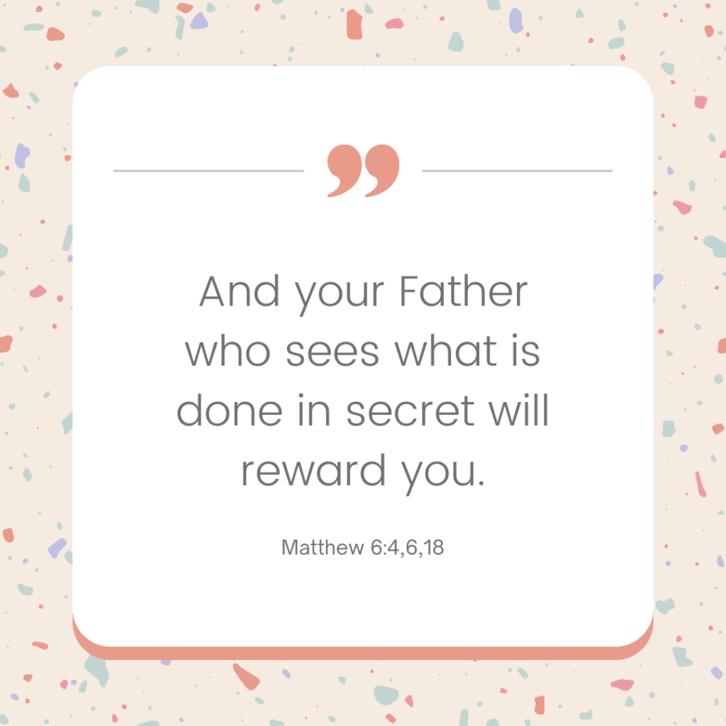 In contrast, the person who is solely focused on pleasing God ignores public opinion. They know the real treasure, the real reward, will be given by the Father when this life is over. I don’t believe Jesus is saying that we should never pray in public or that no one should ever know if we make a donation, or that it’s a sin if people find out you are fasting. In fact, He just told us that we ought to let our light shine before men in such a way that they may see your good works, and glorify your Father who is in heaven (Matthew 5:16). He’s teaching us about our attitude toward these things. Do we do them to be noticed, or are they simply an overflow of an intimate relationship with Jesus? In our heart of hearts, do we want God to be honored and glorified, or us?