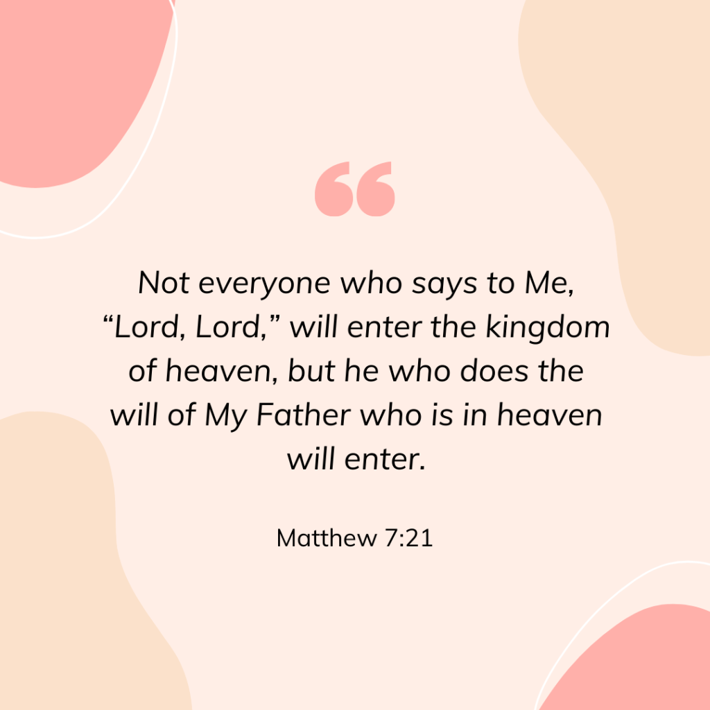 Matthew 7:21 – Not everyone who says to Me, “Lord, Lord,” will enter the kingdom of heaven, but he who does the will of My Father who is in heaven will enter.