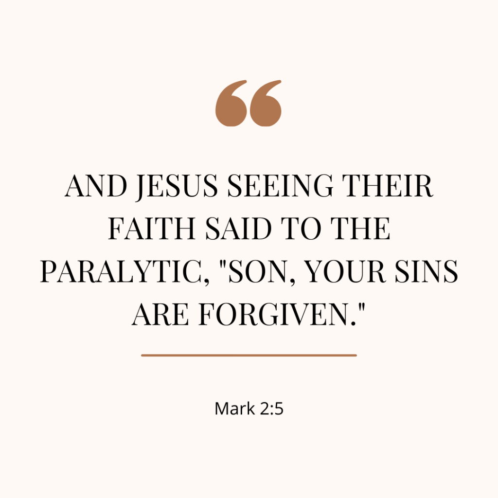 Jesus sees their faith. Whose faith? The man’s faith, certainly, to risk humiliation to arrive in such a manner, exposing his need to the crowd. But also, his friends’ faith, who were willing to do whatever it took to bring the man to Jesus. Jesus speaks five simple words, “Son, your sins are forgiven.”