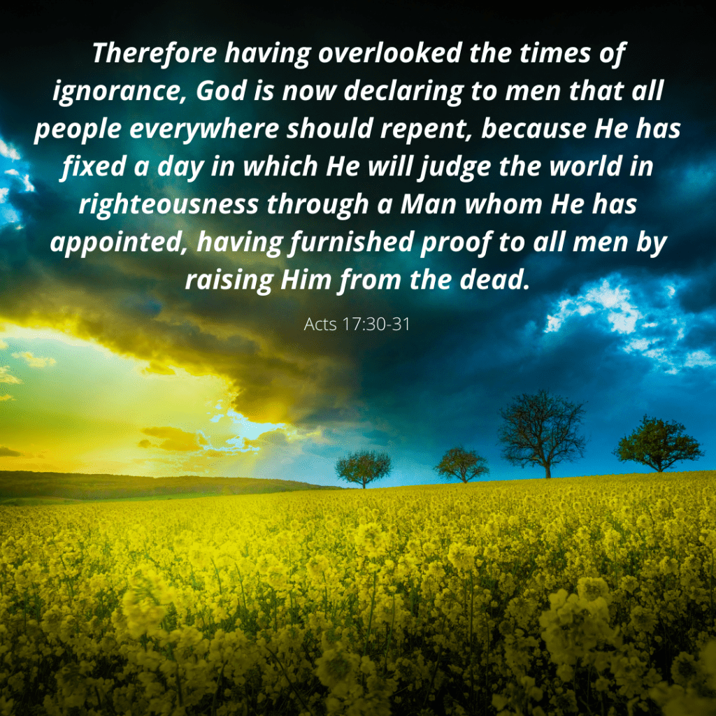 Acts 17:30-31 – Therefore having overlooked the times of ignorance, God is now declaring to men that all people everywhere should repent, because He has fixed a day in which He will judge the world in righteousness through a Man whom He has appointed, having furnished proof to all men by raising Him from the dead.