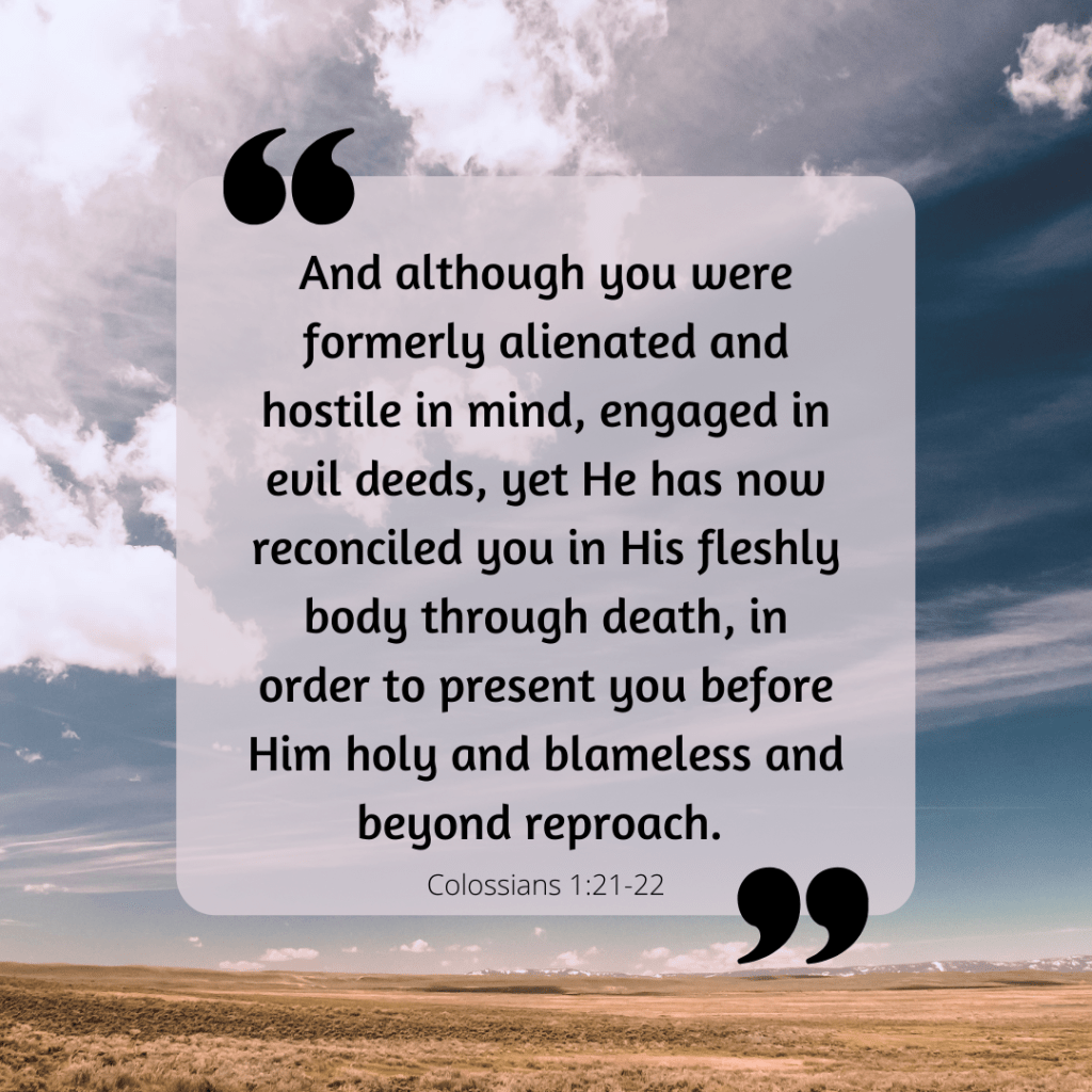 Colossians 1:21-23a – And although you were formerly alienated and hostile in mind, engaged in evil deeds, yet He has now reconciled you in His fleshly body through death, in order to present you before Him holy and blameless and beyond reproach – if indeed you continue in the faith firmly established and steadfast, and not moved away from the hope of the gospel that you have heard.