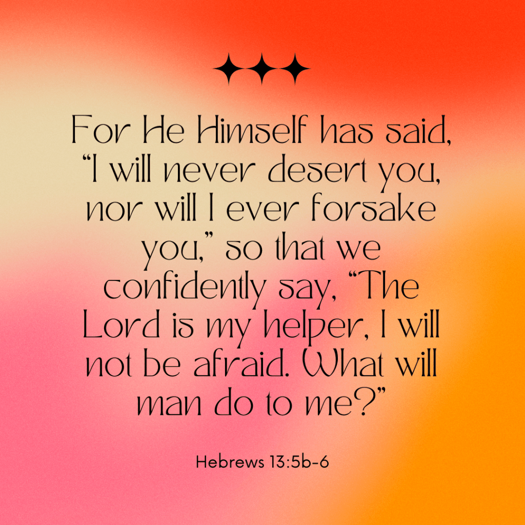 Hebrews 13:5b-6 – For He Himself has said, “I will never desert you, nor will I ever forsake you,” so that we confidently say, “The Lord is my helper, I will not be afraid. What will man do to me?”