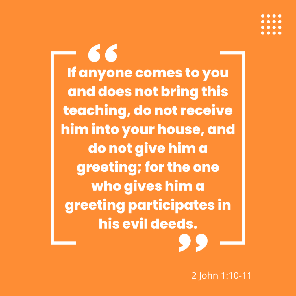 2 John 1:10-11 – If anyone comes to you and does not bring this teaching, do not receive him into your house, and do not give him a greeting; for the one who gives him a greeting participates in his evil deeds.