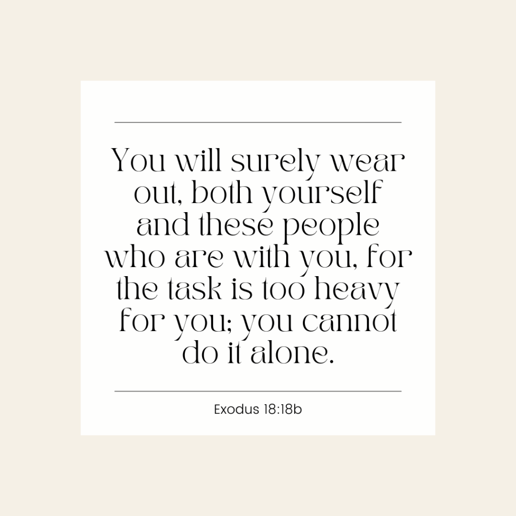 Jethro wisely sees that this can’t last. You will surely wear out, both yourself and these people who are with you, for the task is too heavy for you; you cannot do it alone (Exodus 18:18).