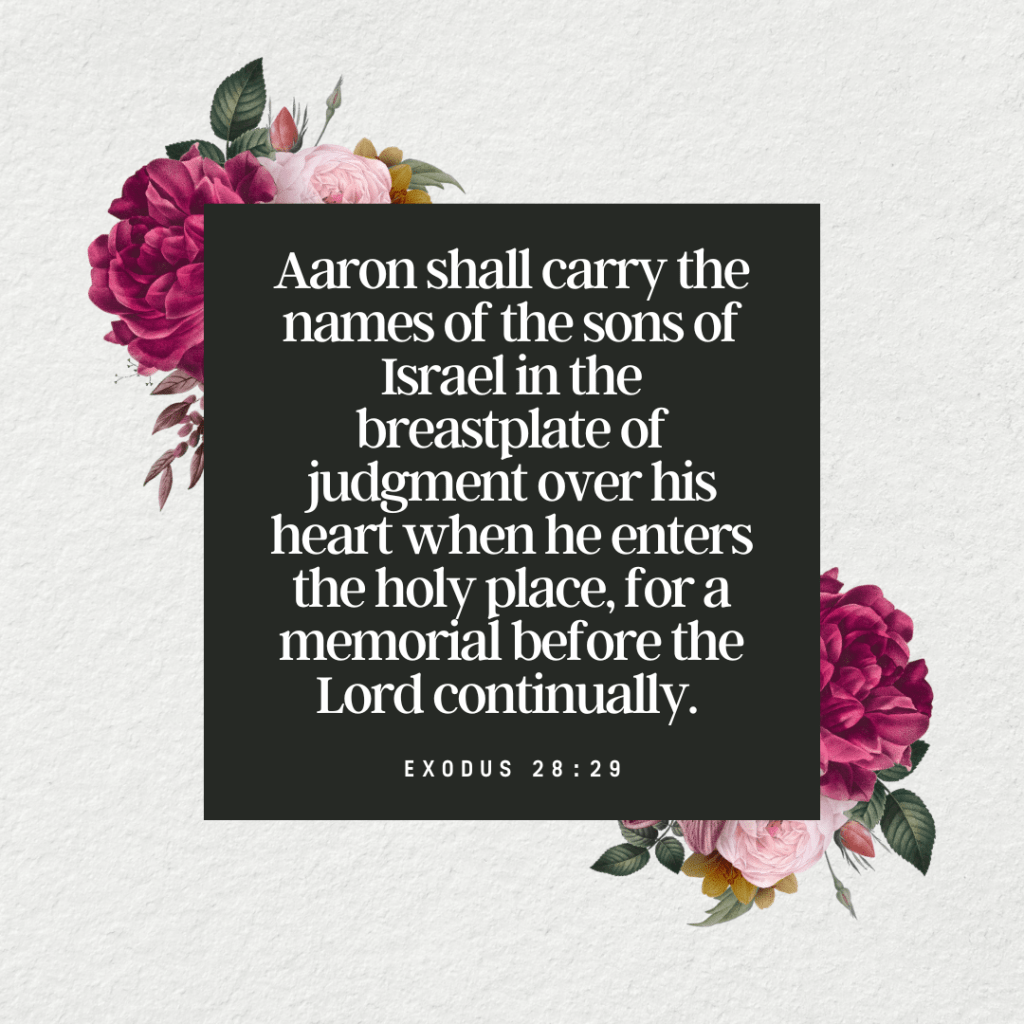 Exodus 28:29-30 – Aaron shall carry the names of the sons of Israel in the breastplate of judgment over his heart when he enters the holy place, for a memorial before the Lord continually. You shall put in the breastplate of judgment the Urim and the Thummim, and they shall be over Aaron’s heart when he goes in before the Lord; and Aaron shall carry the judgment of the sons of Israel over his heart before the Lord continually.
