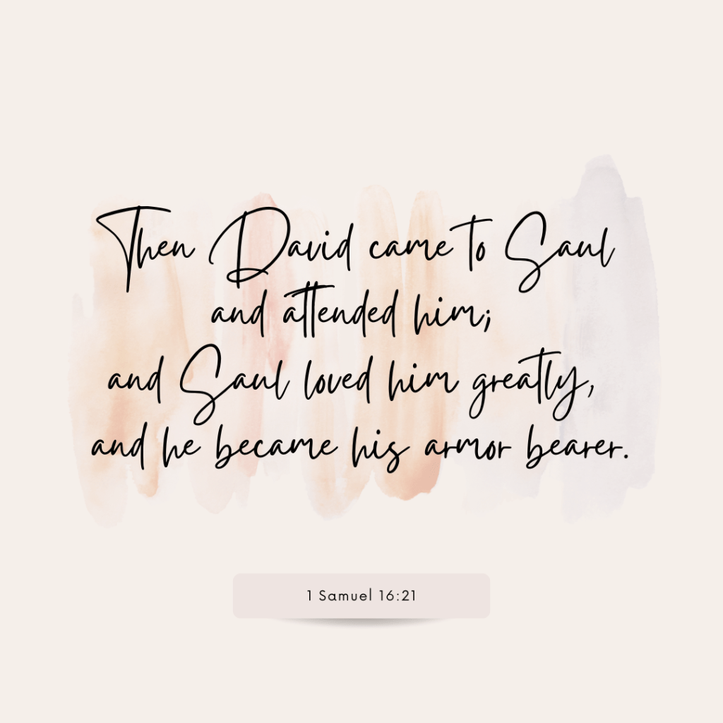 The battle with Goliath was not the first time Saul encountered David. Before this happened, David served Saul not as a soldier, but as a musician. God had not only removed His Spirit from Saul but had sent an evil spirit to torment him (revealing that God has authority over ALL spirits, good and evil). One of Saul’s servants recommends a harpist be employed to soothe Saul’s mind and thoughts when he is tormented, and it just so happens that David is that person. We know what kind of music David composed by reading the Psalms. His presence brought the presence of the Holy Spirit into Saul’s house, chasing away those depressed, angry, and anxious thoughts, at least for a time.