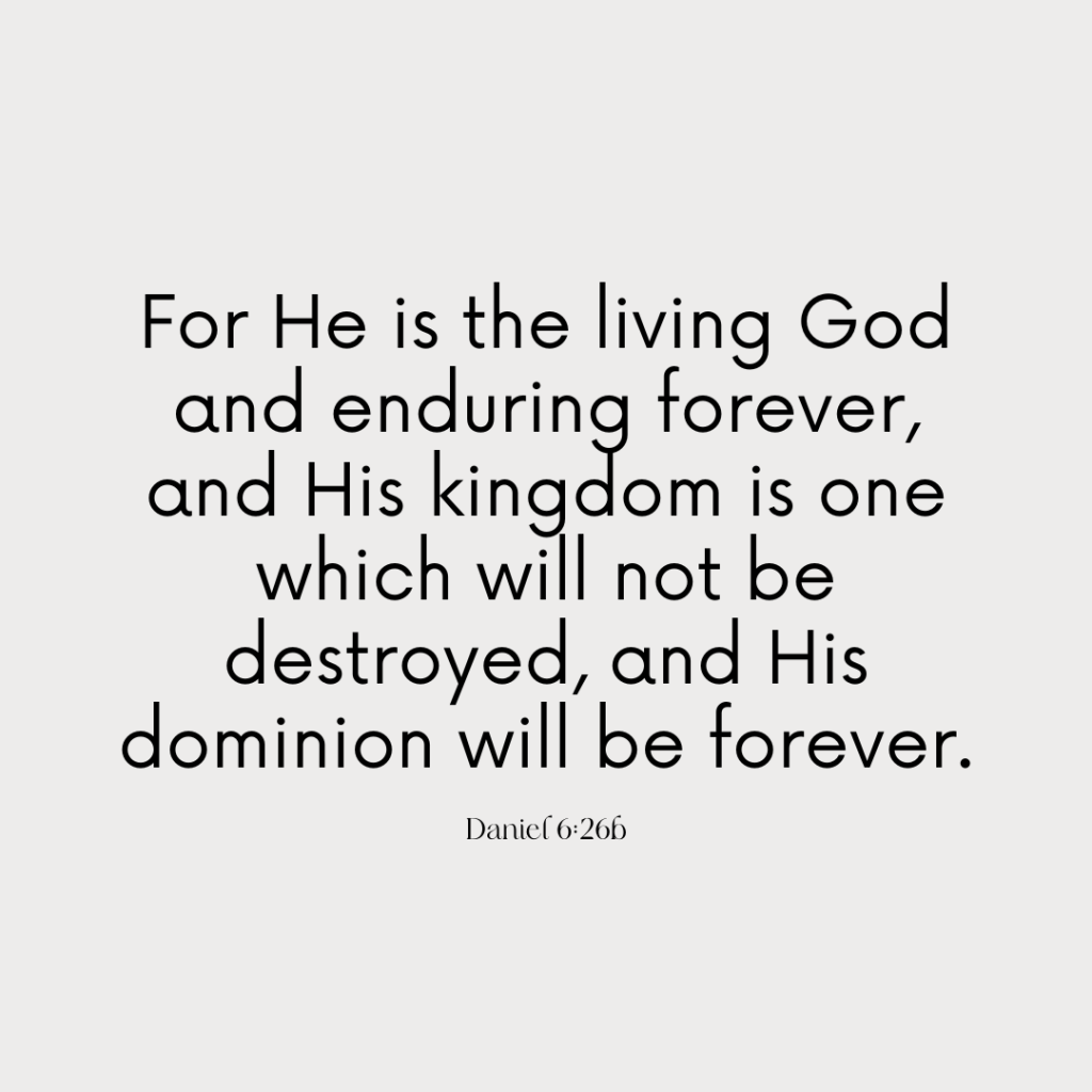 Both Daniel and his friends experienced the protective power of God’s presence. When faced with a choice to worship Nebuchadnezzar or worship the God in heaven, Shadrach, Meshach, and Abednego chose certain death over compromise, but God’s presence appeared with them in the fiery furnace. Years later, having been promoted over his peers under Darius’ rule, Daniel found himself in a quandary. He could remain faithful to his spiritual walk and continue seeking God’s presence in prayer as was his daily custom, trusting God’s protection. Or, he could hide in fear of man and withdraw in secret, hiding his relationship with God in deference to a pagan king. Every child knows the story – God shut the lions’ mouths and Darius learned there is a God in heaven – the living and enduring God whose kingdom will not be destroyed and whose dominion will be forever(Daniel 6:26).