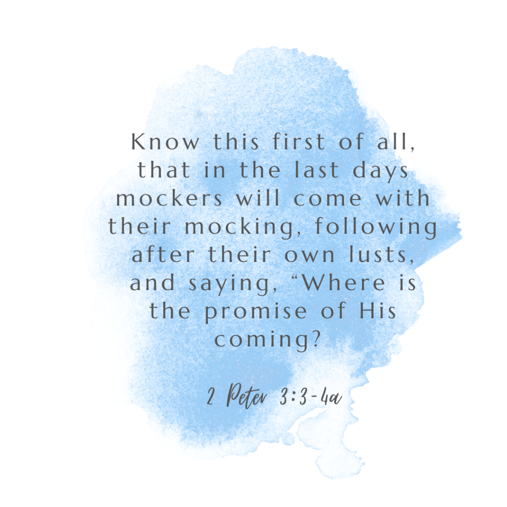 2 Peter 3:1-18 – Know this first of all, that in the last days mockers will come with their mocking, following after their own lusts, and saying, “Where is the promise of His coming? For ever since the fathers fell asleep, all continues just as it was from the beginning of creation.” For when they maintain this, it escapes their notice that by the word of God the heavens existed long ago and the earth was formed out of water and by water, through which the world at that time was destroyed, being flooded with water. But by His word the present heavens and earth are being reserved for fire, kept for the day of judgment and destruction of ungodly men.