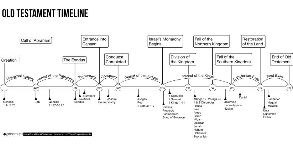 When you first begin studying the Old Testament, the 39 books might seem disorganized and disconnected from one another. We tend to read each book separately, standing alone from the others, but really, the Old Testament is one story that unfolds over a period of about four thousand years. Many of the books overlap in actual time. The timeline pictured below puts things in perspective.