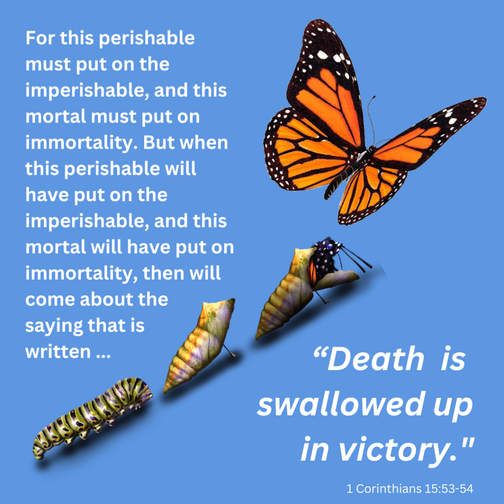 If they know Jesus, take heart. They are entering the chrysalis, that stage of life that is simply the door to eternity. As they close their eyes for the last time in this world, they will emerge in the bright lights of the glory of God, mortality shed, having become a completely new creature – an immortal, glorified being made to worship and enjoy the pleasures of the presence of God forever.