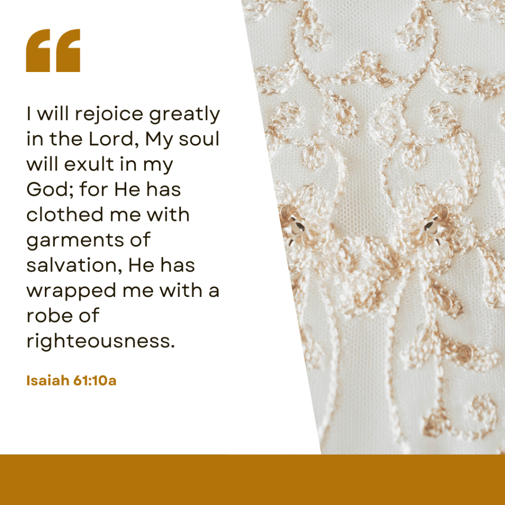 Jesus gave us a spiritual robe of righteousness that God sees. Now our job is to choose wisely our earthly “wardrobe” (our words, actions, attitudes, etc.) appropriate to someone wearing the royal robe of a child of God.