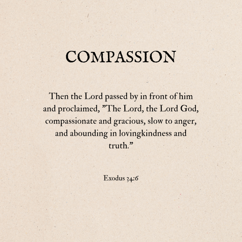 God proclaimed His name to Moses in response to his request to see God’s glory. When we get a glimpse of God’s glory, we are seeing His attributes on display. How comforting to read that God defines Himself as compassionate. His very essence is one of compassion, moved to act because of the suffering of humanity.