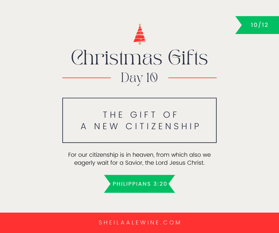 I’m so grateful that my heavenly citizenship was a gift. Jesus paid the price in full by His death on the cross. There were no tests to pass before I was granted the full rights of my citizenship, but in grace and mercy, He gave me the living Word of God to guide me as I learn to walk in my new citizenship. I was never asked to prove that I was worthy; instead, He made me worthy by cleansing me from all my sins and sending the Holy Spirit to live His life through me.