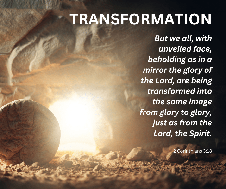 2 Corinthians 3:18 – But we all, with unveiled face, beholding as in a mirror the glory of the Lord, are being transformed into the same image from glory to glory, just as from the Lord, the Spirit.