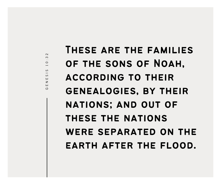 Genesis 10-11 contains what is often called the Table of Nations. Remember, the Bible is a book of history, recording how God formed a nation through which He could send His Son and fulfill the promise made in Genesis 3:15. Genesis 10 lays out Noah’s three sons and their descendants, while Genesis 11:1-9 describes how God separated the people at the Tower of Babel. The rest of that chapter gives us more details on Shem’s line, ending with Abraham.