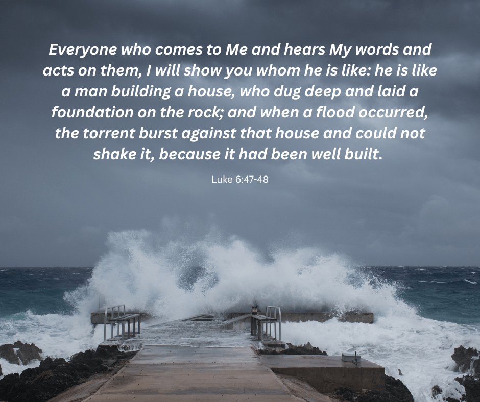 Luke 6:47-49 – Everyone who comes to Me and hears My words and acts on them, I will show you whom he is like: he is like a man building a house, who dug deep and laid a foundation on the rock; and when a flood occurred, the torrent burst against that house and could not shake it, because it had been well built. But the one who has heard and has not acted accordingly, is like a man who built a house on the ground without any foundation; and the torrent burst against it and immediately it collapsed, and the ruin of that house was great.