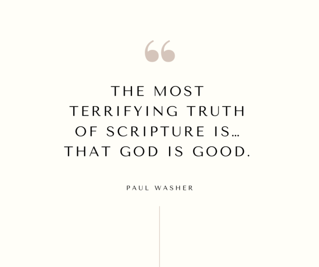 I looked at this crowd of university students and I said, “I am going to share with you the most terrifying truth in the Scriptures.” And I kept telling them and warning them, “I am about to share with you the most terrifying truth that anyone could ever know about God.” And so, when they were all poised on the edge of their seat, I looked at them and I said, “Here it is. The most terrifying truth of Scripture is…that God is good.”